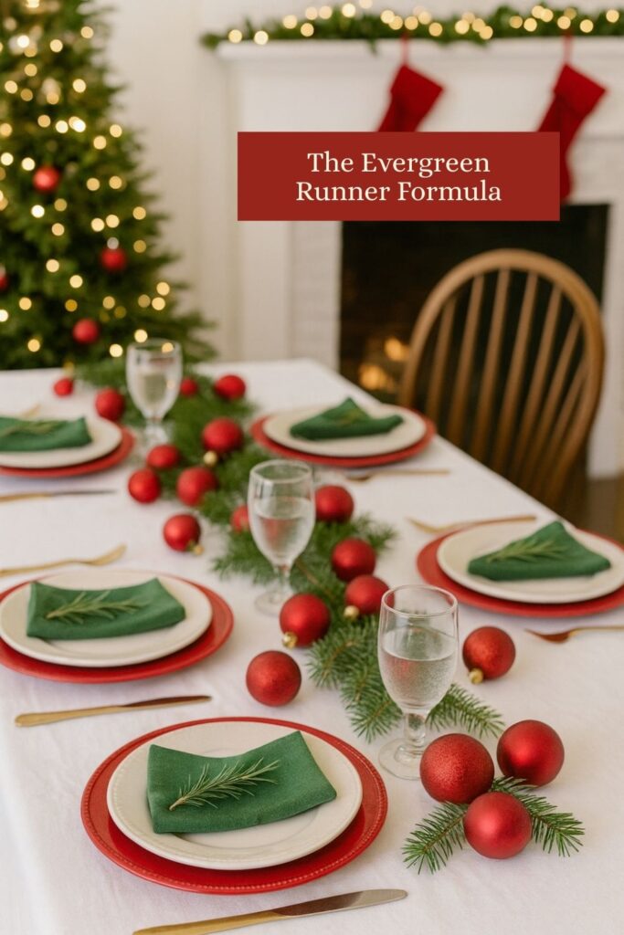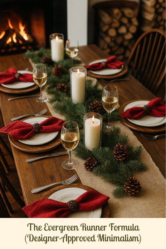Designers love the evergreen runner because it fills the entire table but doesnโt take up visual space. It creates an instant base that makes anything you add look intentional.