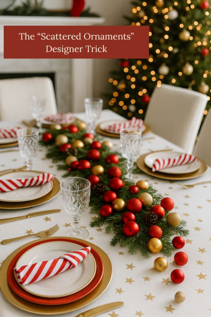 Instead of confining ornaments to one spot, they scatter them across the table runner. This instantly adds shimmer and color without extra work.
