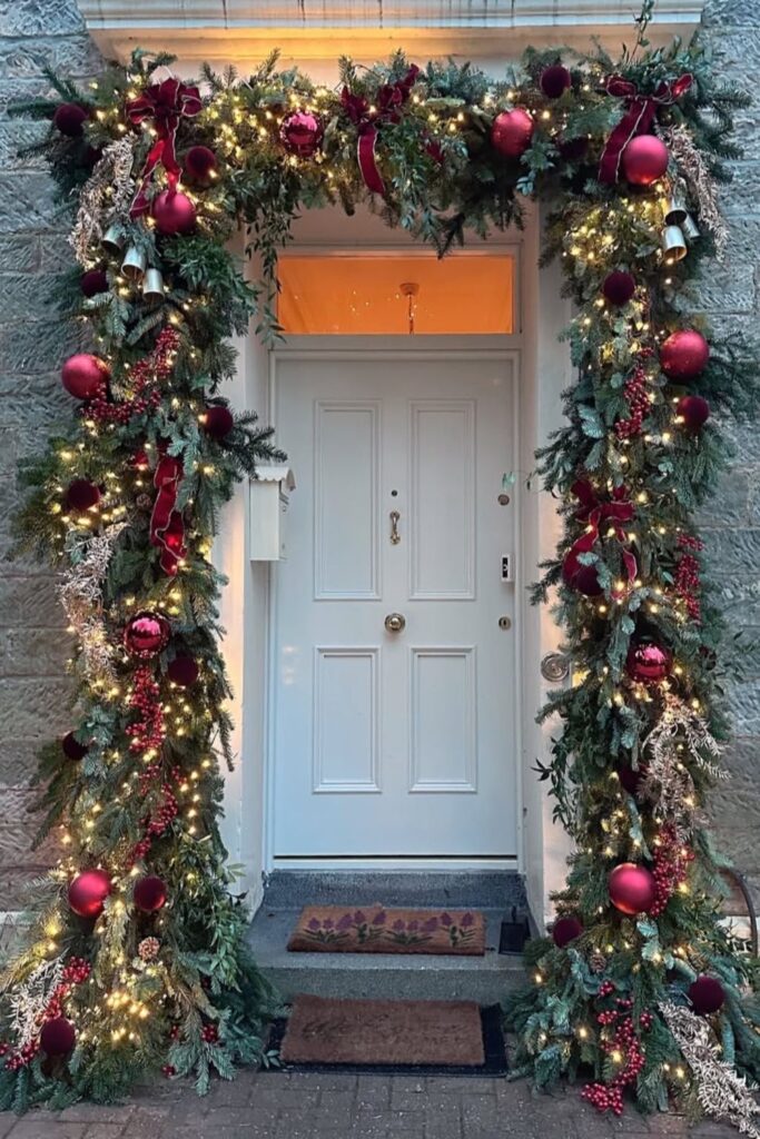 A full, fluffed garland frames your door like a forest path. Hidden micro lights make the greenery glow at dusk.