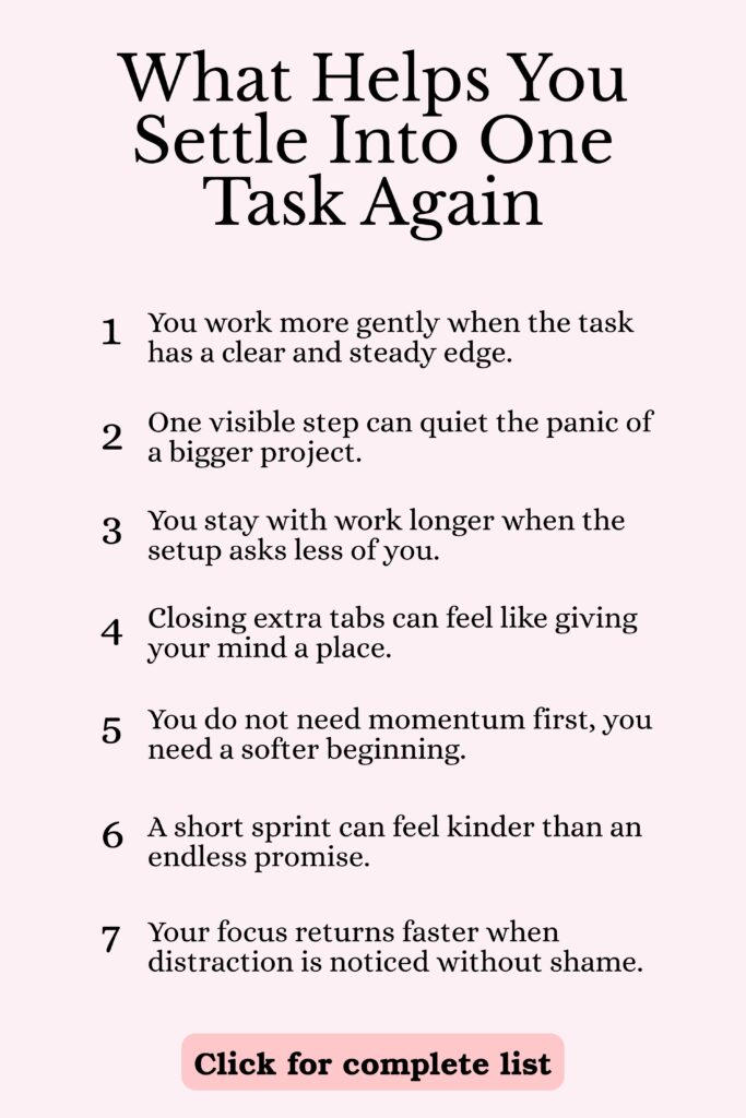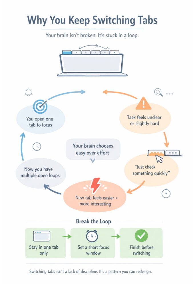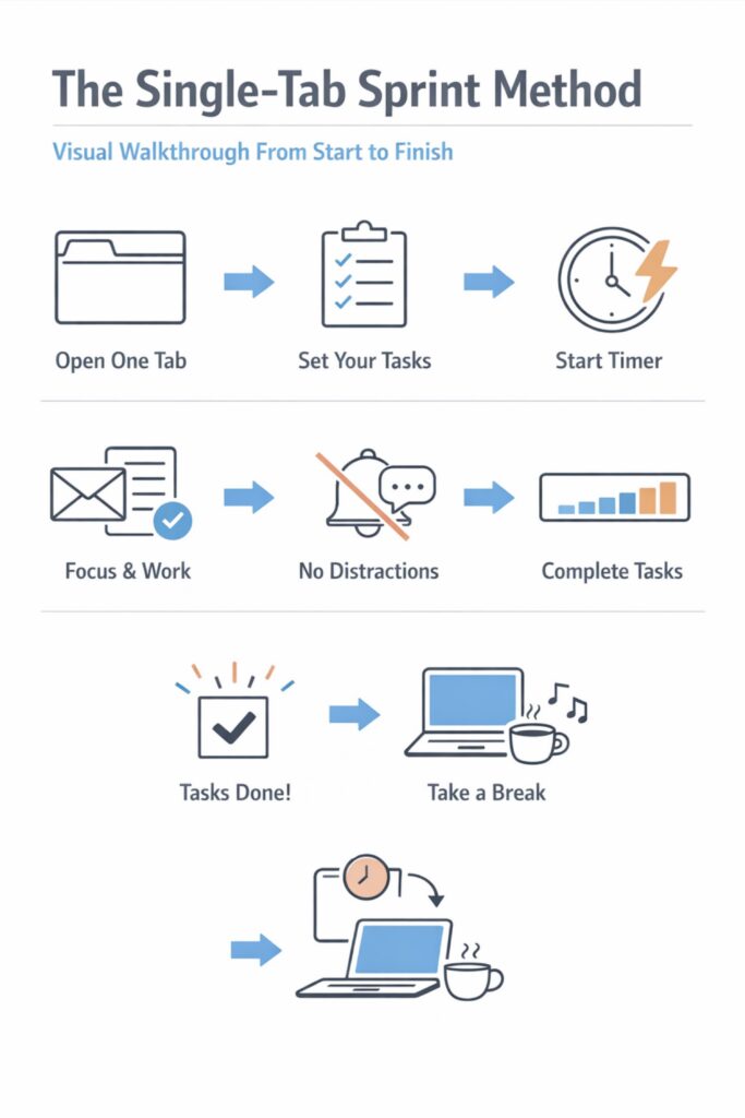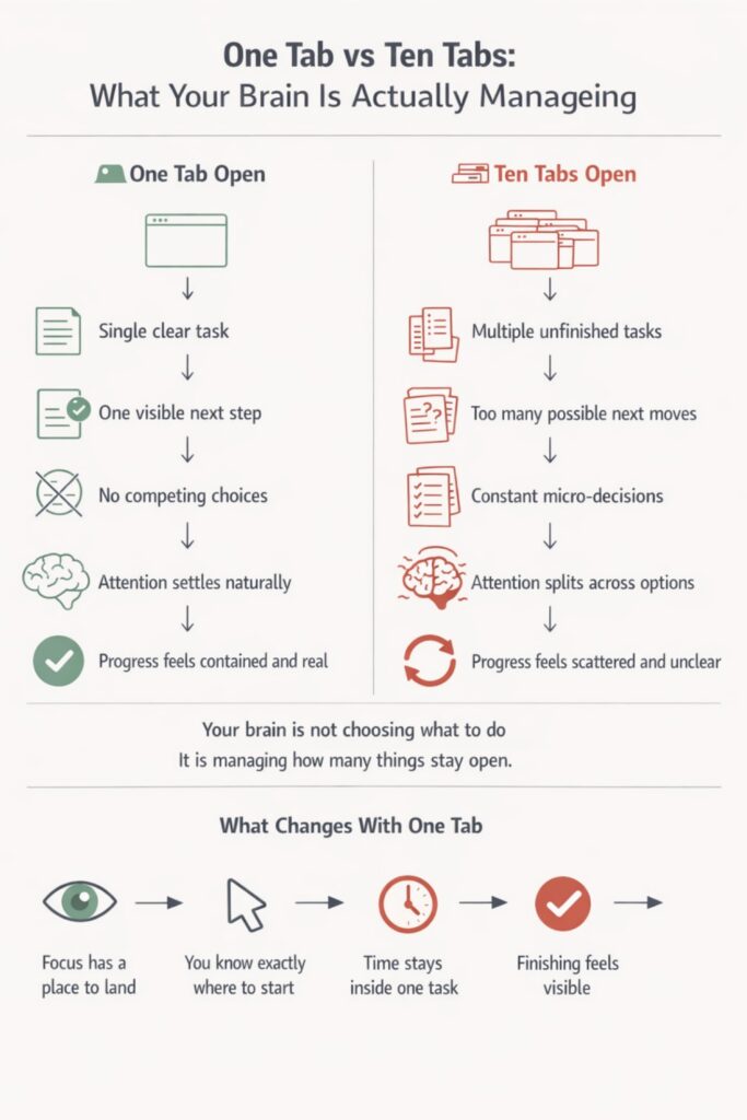 A single-tab setup works because it removes choice at the moment when choice is most dangerous. You are not trying to become a different person. You are making it easier to stay with one task for one short stretch of time.