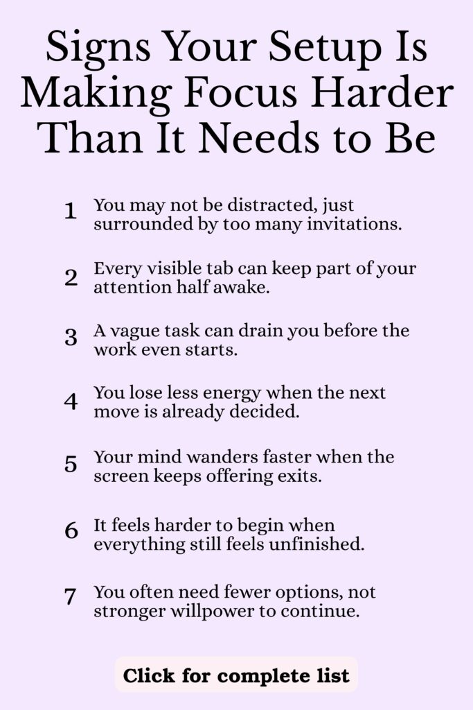This step matters because focus often breaks before the work even starts. People open the task, leave everything else visible, and assume they will just resist temptation through sheer effort. That usually does not work for long.