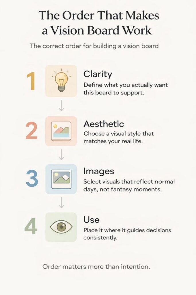 A vision board is not a craft project and itโs not a collection of pretty pictures. Itโs a visual planning tool. If you build it without structure, it becomes decoration. If you build it in the right order, it becomes something you actually use.
