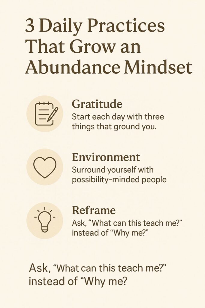 Developing an abundance mindset entails consciously being grateful for all you have. Better to be with people who have an abundance mindset too! Several studies show that the people we spend time with highly influence how we think and act. Also, practice reframing challenges into learning opportunities. So your mentality shifts from “I have a problem” to “How can I learn or grow from this?”