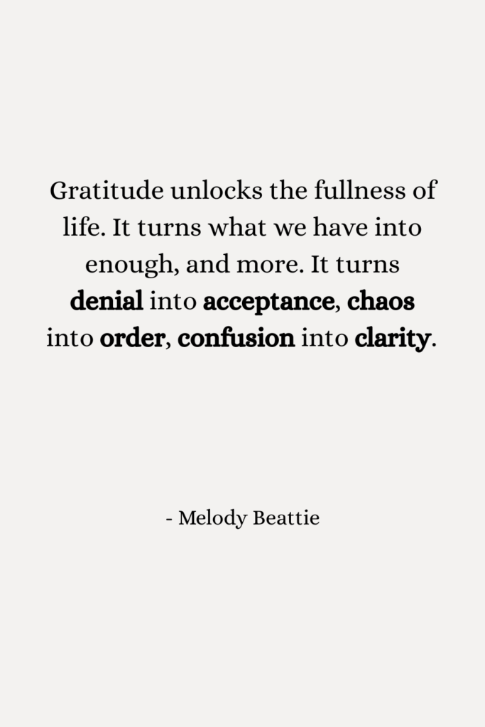 #1 “Gratitude unlocks the fullness of life. It turns what we have into enough, and more. It turns denial into acceptance, chaos into order, confusion into clarity.” – Melody Beattie