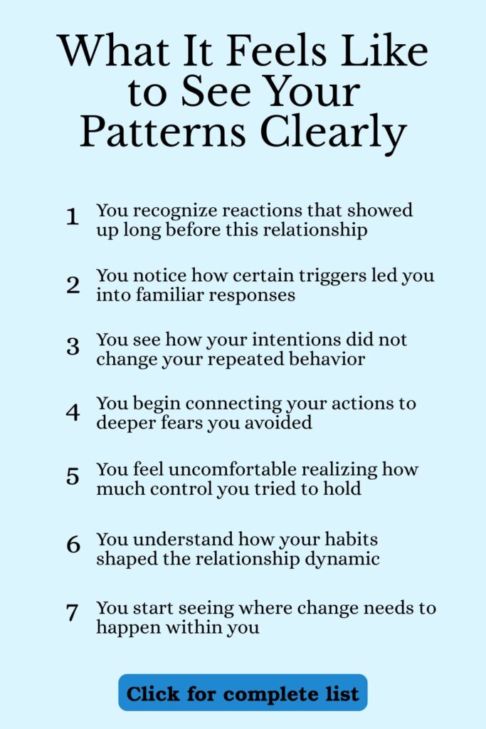 A relationship coach will often map this out with you step by step. Not theory. Actual moments from your past arguments. You start to see your patterns, not just your intentions.