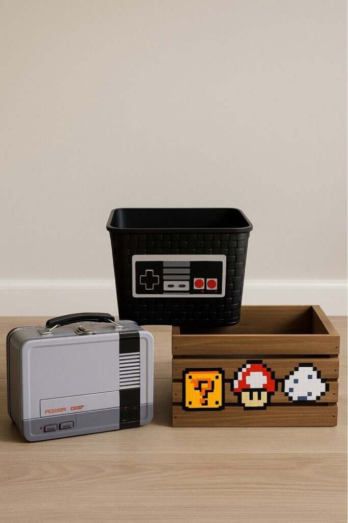 - A wooden crate wrapped with pixel-art or gaming decals