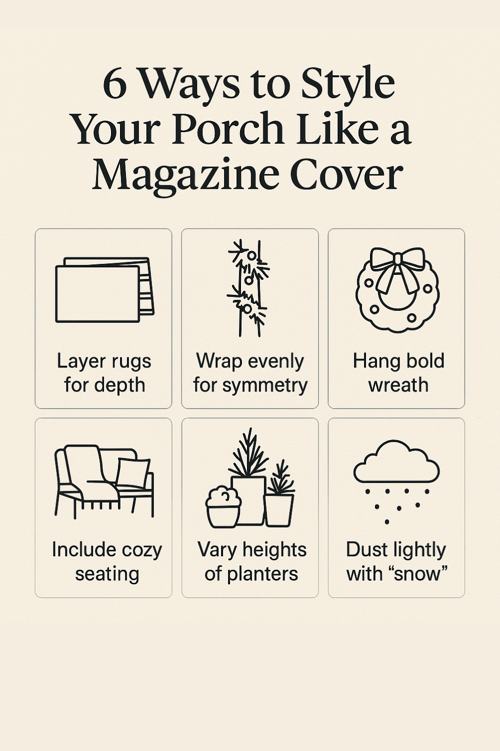 Add powdered snow or shredded paper snow around the base of lanterns and planters for a realistic effect. If you’re photographing your porch for cards or social media, this detail makes the entire setup pop.