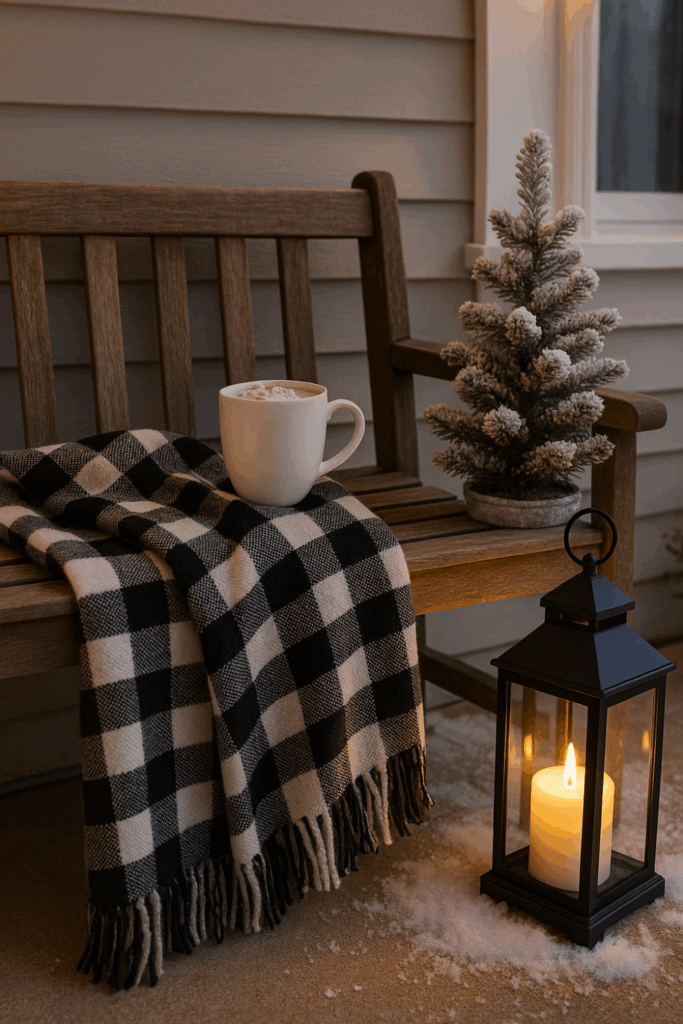 Start with a small bench or chair and layer it with a plaid blanket and a few throw pillows in seasonal patterns. If your porch is covered, consider adding a knit throw for a touch of softness and comfort.