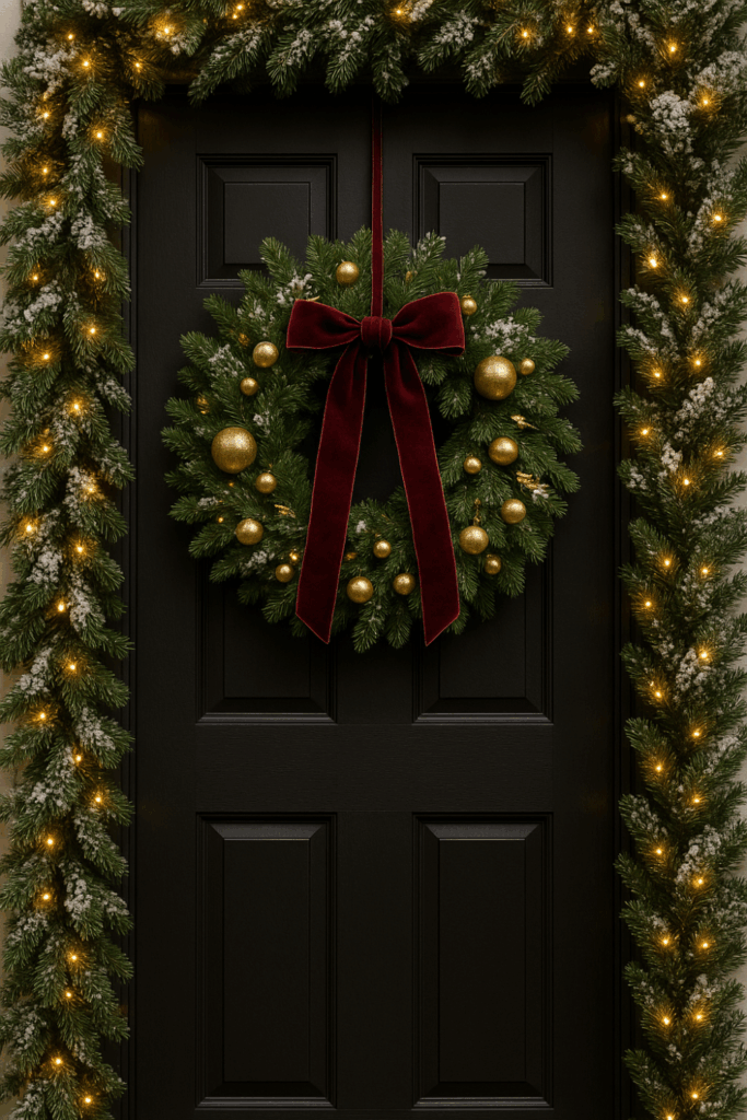 If you’re feeling creative, go beyond traditional circular wreaths. Try a square frame wrapped in garland or a vertical swag tied with a velvet ribbon. Small ornaments or bells add movement and a soft jingle when guests arrive.