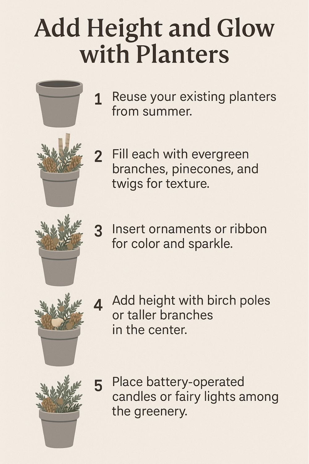 Start by repurposing your existing planters from summer. Fill them with fresh evergreen branches, twigs, and pinecones for texture. Then, add ornaments, ribbon, or artificial berries to bring in pops of color.