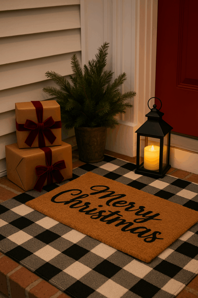 Start with a large, neutral outdoor rug — something in jute, plaid, or buffalo check works beautifully. Then layer a smaller mat on top that says “Merry Christmas” or “Joy to the World.” The contrast creates a sense of depth and polish, like something you’d see in a home magazine.