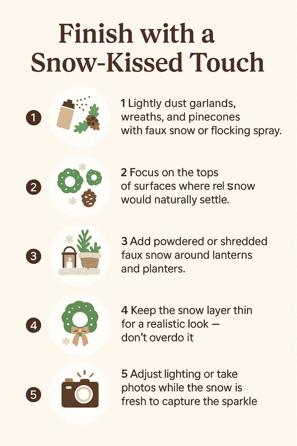 Lightly dust garlands, wreaths, and pinecones with faux snow or flocking spray. Focus on the tops of surfaces where real snow would naturally settle. The goal is subtlety: a soft shimmer that catches light without hiding your decor underneath.
