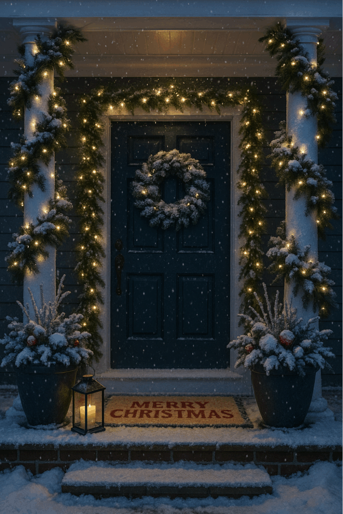 When dusk falls and the garlands start to twinkle, your porch will look like something pulled straight from a Hallmark movie — welcoming, warm, and completely magical.