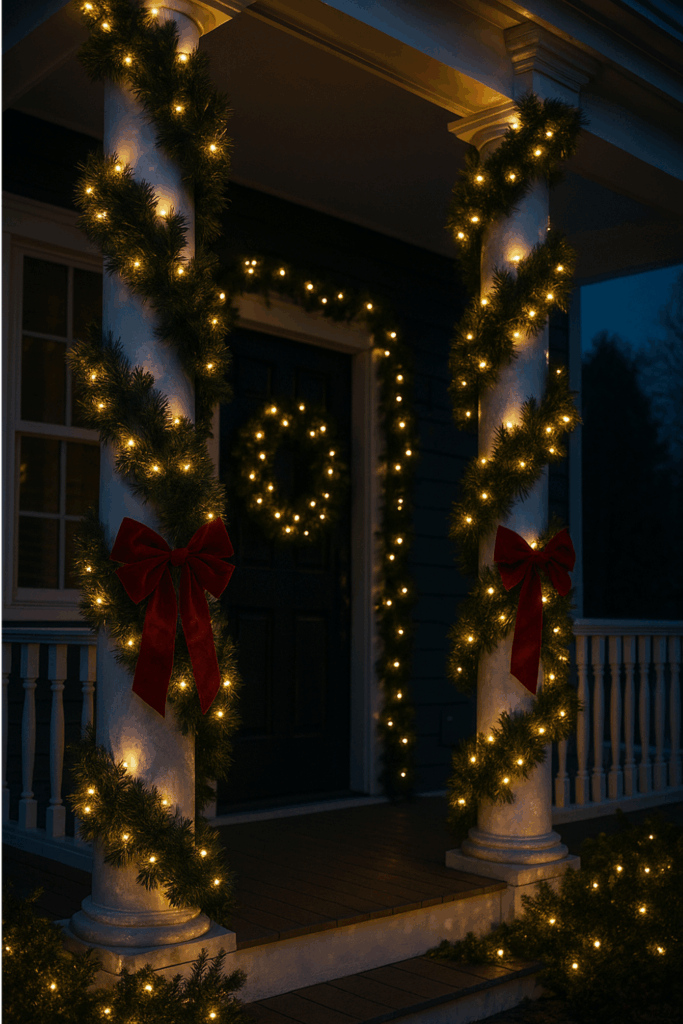 Choose a pre-lit garland if you want instant glow with minimal effort. For a more natural look, layer faux greenery with real pine branches or eucalyptus stems. The mix of textures gives your porch depth and that “designer touch” that makes it look custom.