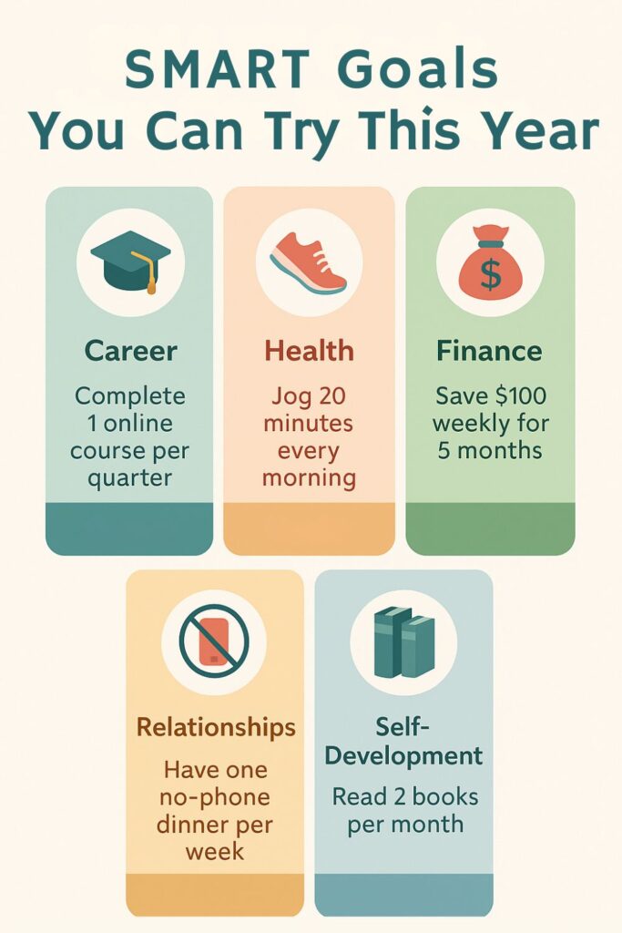 Let’s ensure that SMART goals aren’t just another buzzword you’ll soon forget. To propel your path to goal-achievement, here are five examples of SMART goals in different life areas.