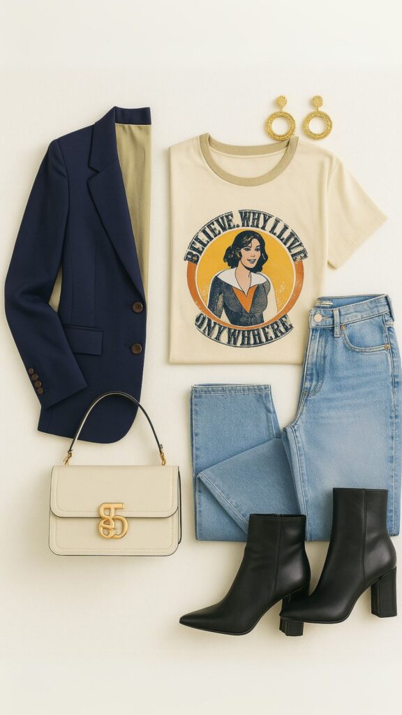 Pair your favorite graphic tee with high-waisted, loose-fitting jeans for a look that’s both comfortable and professional. Tuck in the tee to define your waist and add a structured blazer to bring a touch of formality.