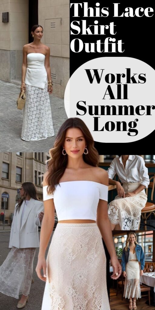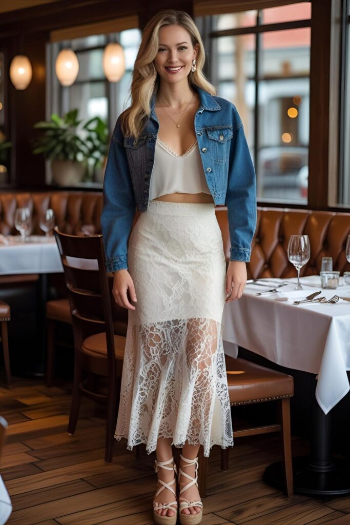 Let the lace be the soft focal point by pairing the skirt with a tucked-in, body-hugging top or a romantic off-shoulder blouse. Add heeled sandals, a delicate necklace, and a lightweight wrap if the evening turns cool.