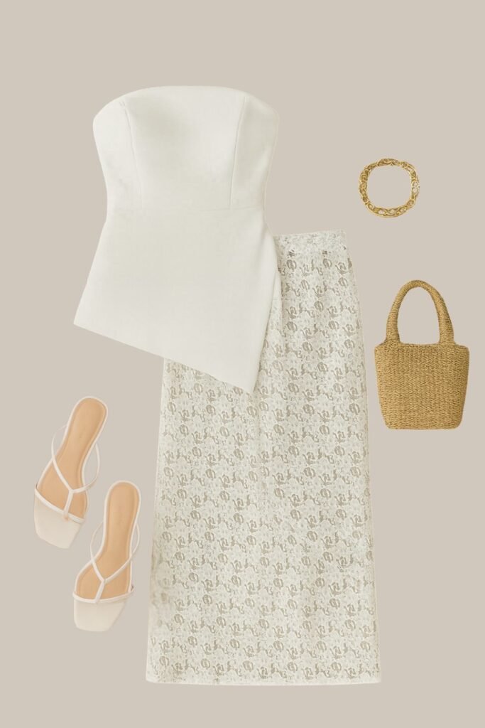 Pair your lace midi with a crisp tucked-in blouse or soft knit top. Add simple flats or low block heels and a structured crossbody or tote. Stick to neutral tones like ivory, blush, or gray to keep the look grounded and professional.