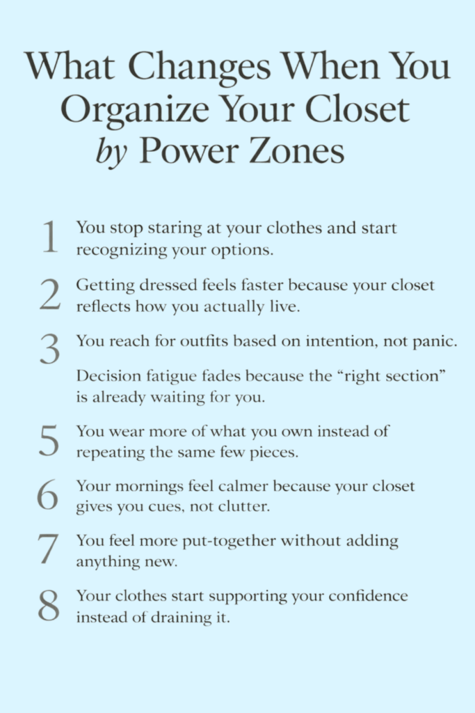 These zones become mini closets within your closet. You train your brain to reach for the right vibe instead of the right item. Itโs intuitive, quick, and deeply satisfying.