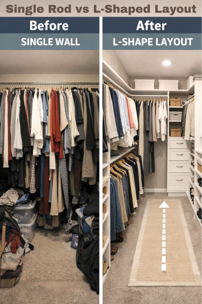 One of the most effective changes in a small walk-in is converting a single long rod wall into an L-shaped configuration. This simple shift improves both flow and capacity.