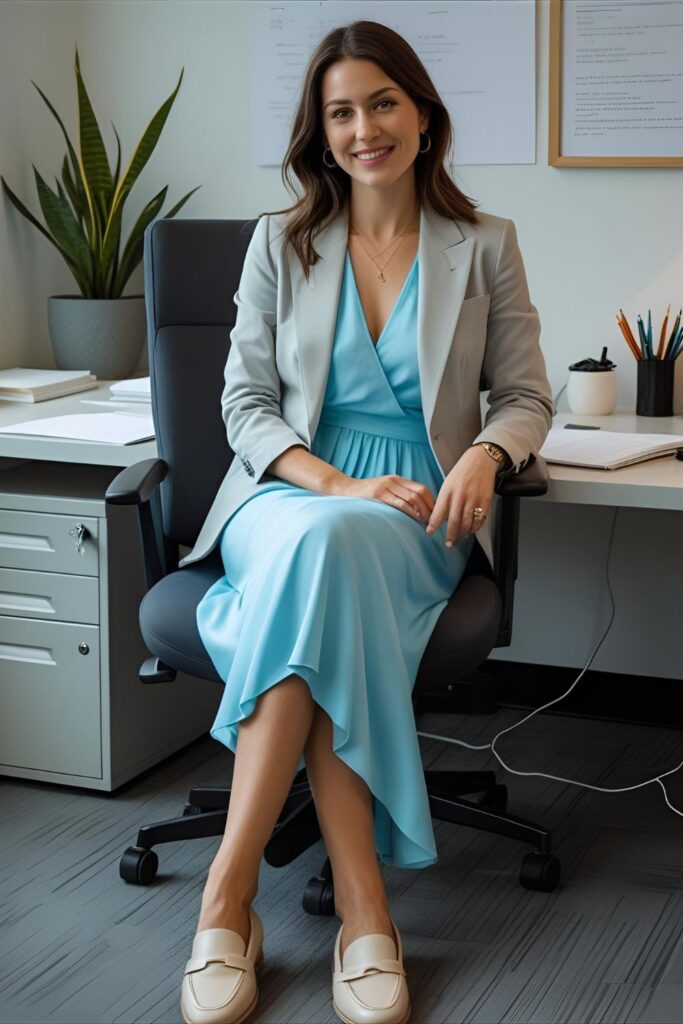 A soft low ponytail and simple gold studs keep it polished without trying too hard. Add a tote that fits your laptop and a neutral belt if your dress has a defined waistline. Itโs the kind of outfit that helps you feel both steady and feminine while youโre getting things done.