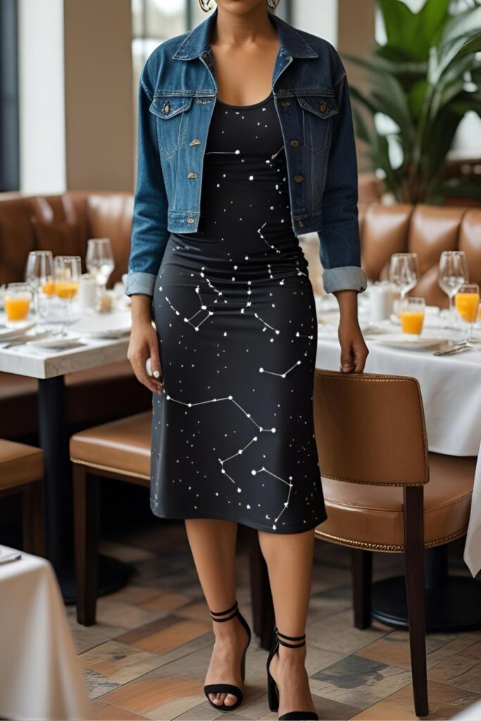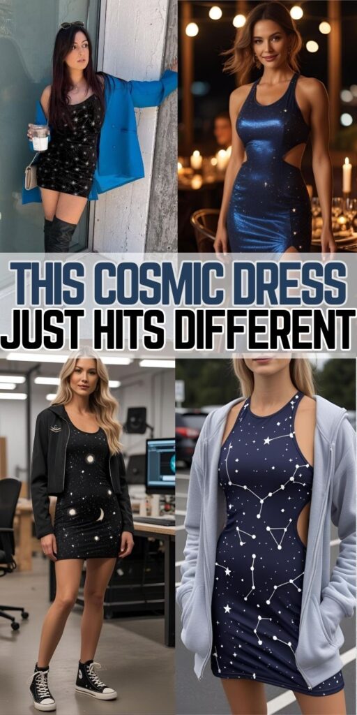 If you want to make this dress Zoom-friendly, throw on a soft cropped cardigan or knit shrug over it and pull your hair into a low ponytail or half-up clip. Stick to light makeup and a pendant necklace that mirrors the celestial vibe without going too glam.