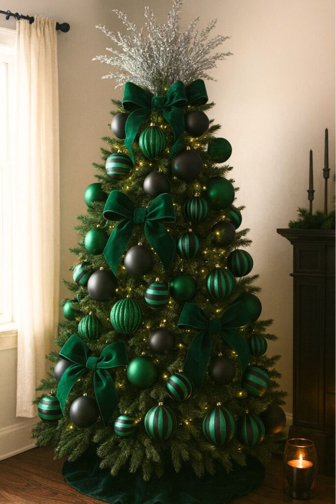 A Black & Emerald Luxe palette blends emerald ornaments with black matte finishes and glass elements for a rich jewel-tone look. Velvet ribbon and faceted ornaments give it a refined, luxurious finish.