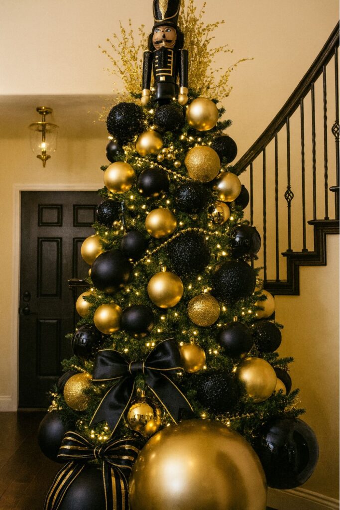 A Black & Gold Art Deco palette combines matte black ornaments with gold geometric accents and satin ribbon. Mirrored ornaments, gold branches, or feathered picks amplify the glamorous, vintage feel.