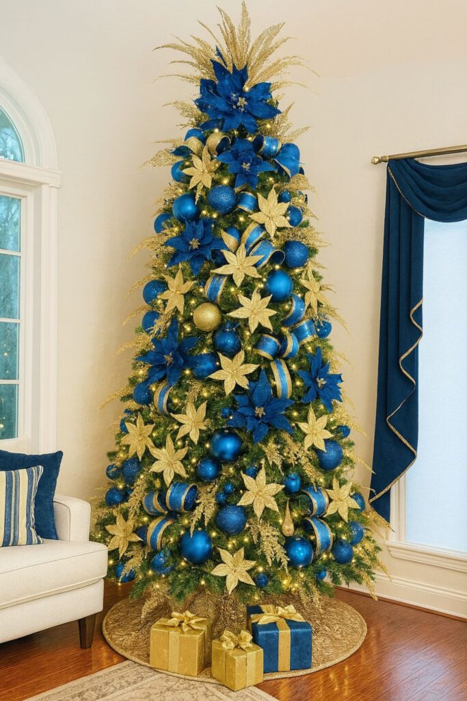 Want luxury? A Royal Blue & Gold palette shines with velvet ribbon, gold glass ornaments, and gold mesh garland. The deep blue tones make the tree look taller and more refined.