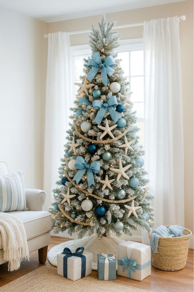 For something breezy, the Coastal Blue & White palette uses soft blue ornaments, white accents, and rope-textured ribbon. Natural wood pieces or sandy neutrals help the tree feel fresh and beachy.