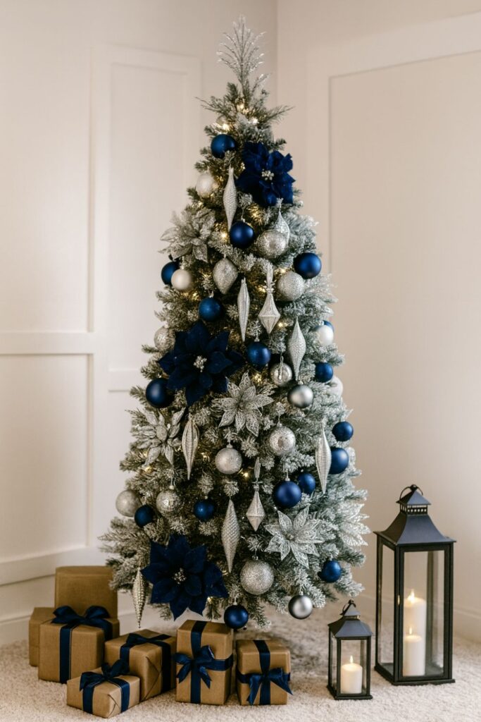 A Navy & Silver Midnight palette combines navy ornaments with silver baubles, cool-toned ribbon, and metallic branches. Icicle ornaments or mirrored spheres add an enchanting nighttime sparkle.