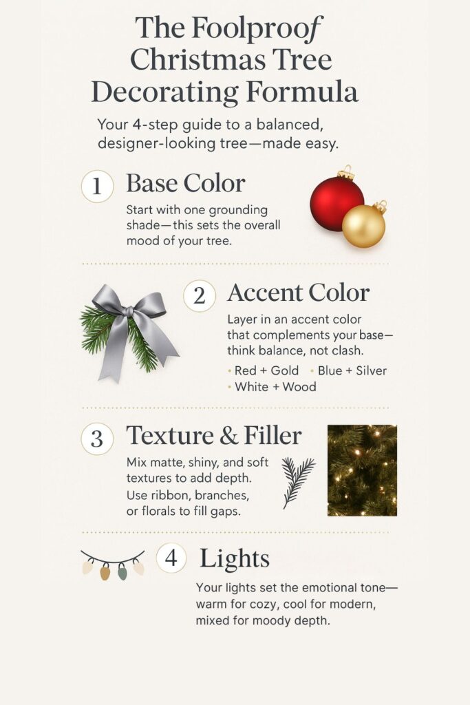 The secret comes down to this: Base Color + Accent Color + Texture Element + Light Temperature = A tree that actually looks designed. Once you learn how each element works together, you can recreate any aesthetic using items you already own or inexpensive products like ribbon, ornament sets, branches, or decorative fillers.