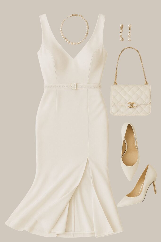 Let the dress and pearls speak for themselves. Add low heels or dainty flats, a soft wrap or sheer cardigan, and a swipe of lip balm or gloss. Keep your hair down or loosely pinned for softness.