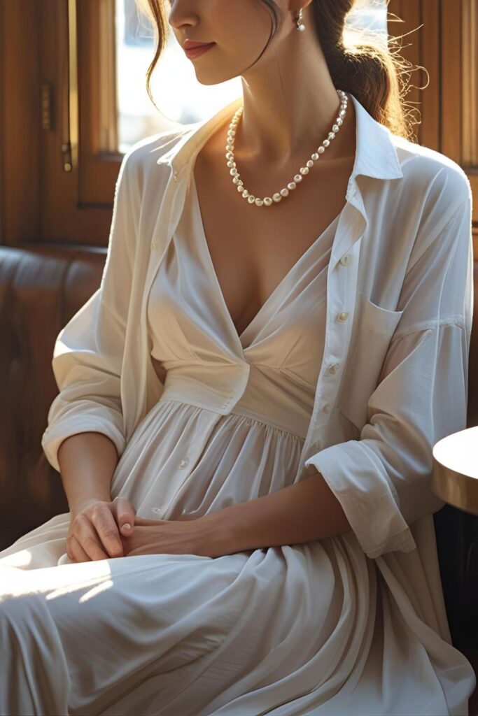 Wear your white dress with a light knit cardigan or a tailored blazer to give it some daytime structure. Add soft loafers or mules, and let the pearl necklace be the one piece of jewelry you wearโit says enough on its own.