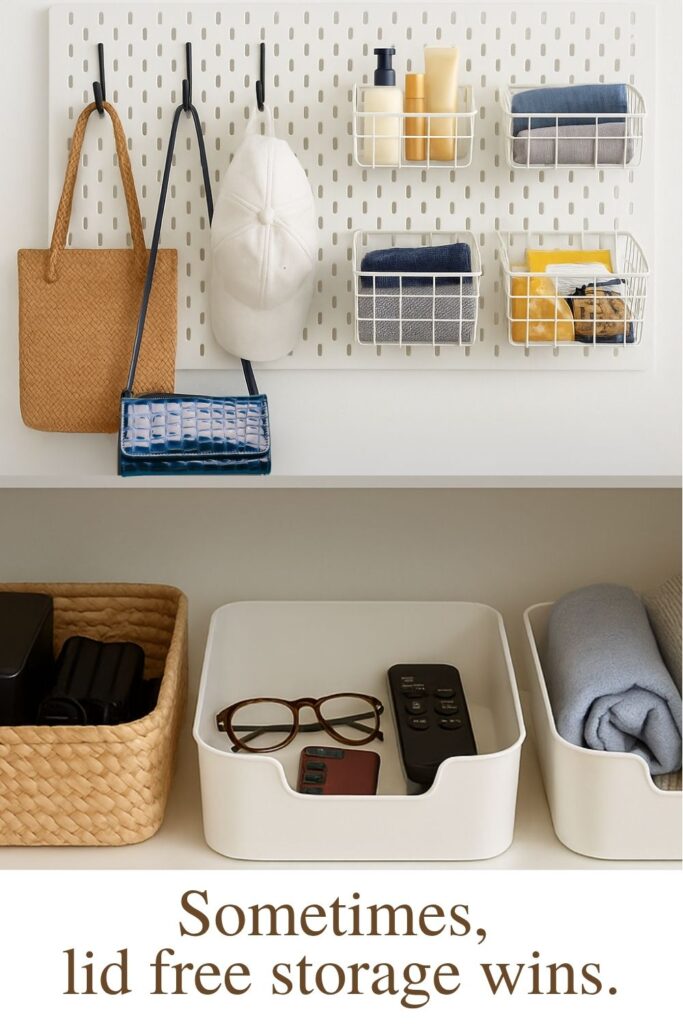 Pro tip: Clear, open-top bins, trays, hooks, or tiered shelves are often better for items you use every day. Save the pretty lidded bins for deep storage or infrequent-use zones.