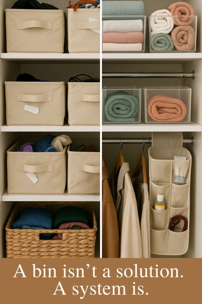 It’s easy to assume storage bins create organization—but they don’t. They’re just a tool. And when used without a plan, they can actually make clutter harder to see, harder to reach, and harder to maintain.