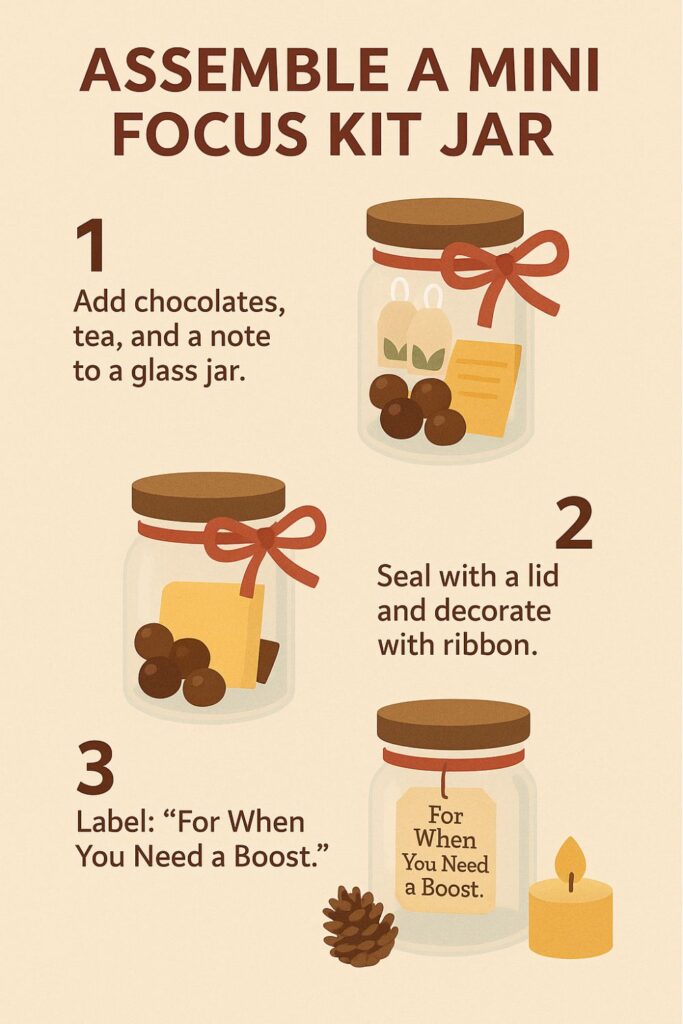 Fill a small jar with little helpers like peppermint gum, herbal tea bags, mini chocolates, and tiny strips of paper with motivational quotes. Add a label that says โFor when your brain needs a boost,โ and youโve created a pocket-sized source of encouragement.