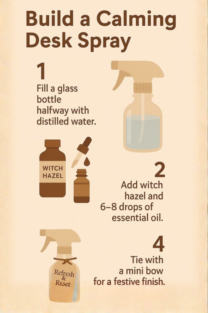 Mix distilled water with witch hazel and a few drops of essential oils like lavender for calm, peppermint for clarity, or eucalyptus for freshness. Pour it into a sleek glass bottle, label it โRefresh & Reset,โ and give your coworker a portable moment of peace.