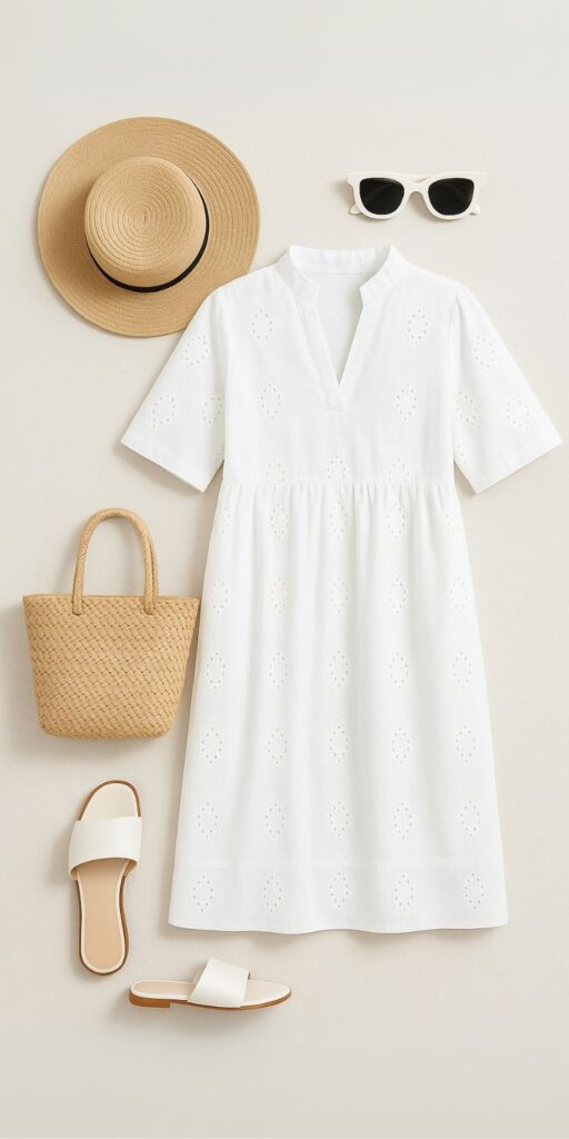 Slide into flat sandals, grab your favorite straw tote, and you’re set. The breezy cut of the dress lets it double as a chic cover-up for poolside lounging or beach strolls. Toss on oversized sunglasses and maybe a shell necklace for full-on resort energy—even if your destination is just brunch on the patio.