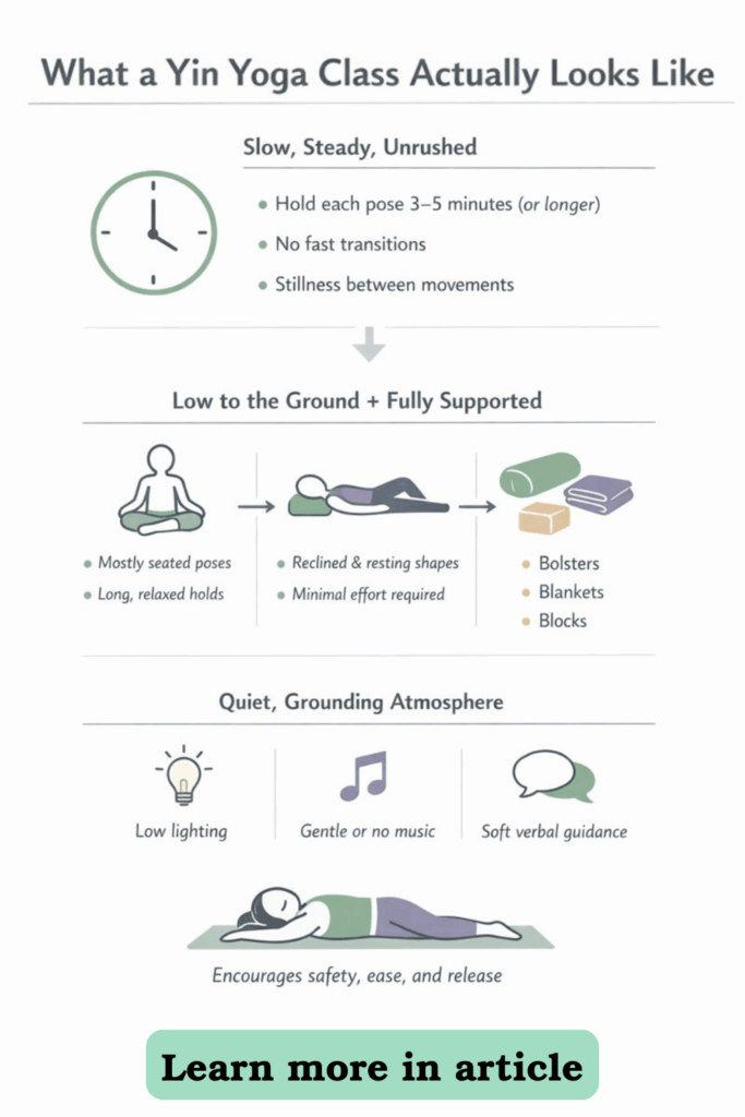 A Yin Yoga class is slow, quiet, and deeply grounding. Instead of flowing quickly between poses, youโll settle into each posture and hold it for three to five minutesโsometimes even longer. The pace allows you to fully relax your muscles and work into the bodyโs connective tissuesโligaments, fascia, and jointsโareas often overlooked in faster practices.