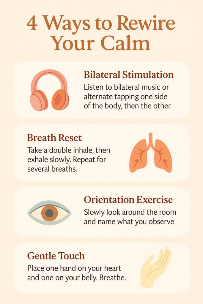 Look around the room slowly and name what you see: “chair, lamp, plant, sky.” This grounds your body in the present and turns off the threat alarm.